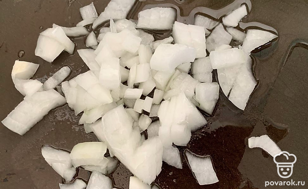 Лук нарезать на кусочки и обжарить на сковородке до золотистой корочки.