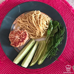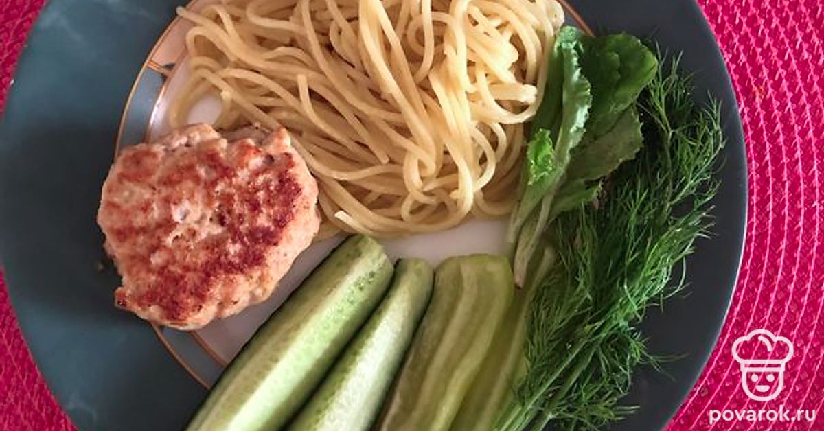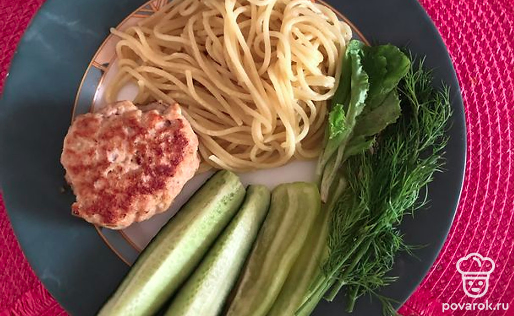 Подавать котлетки с любимым гарниром. Я использовала макароны.