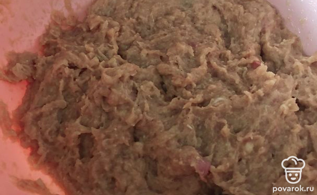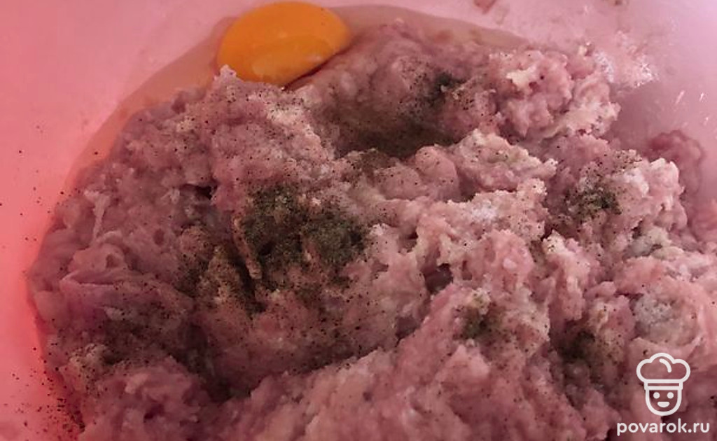 Прокрутить фарш и добавить яйцо, перец и соль.