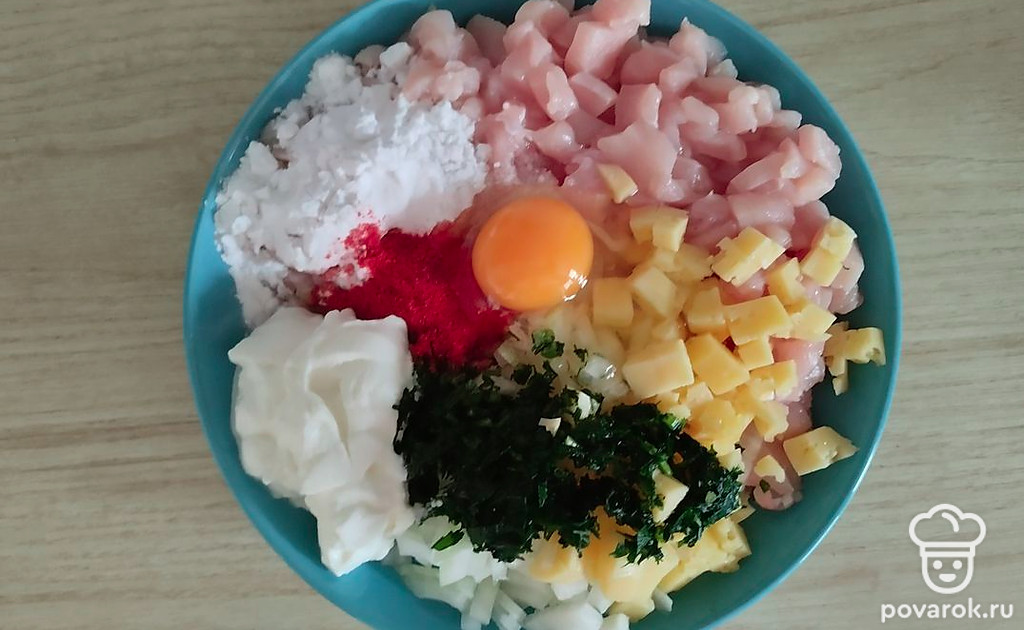 Добавить яйцо, паприку, крахмал, сметану, соль, все перемешать.