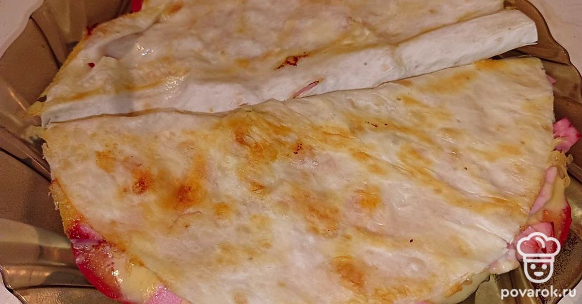Лаваш с колбасой, помидорами и сыром на сковороде