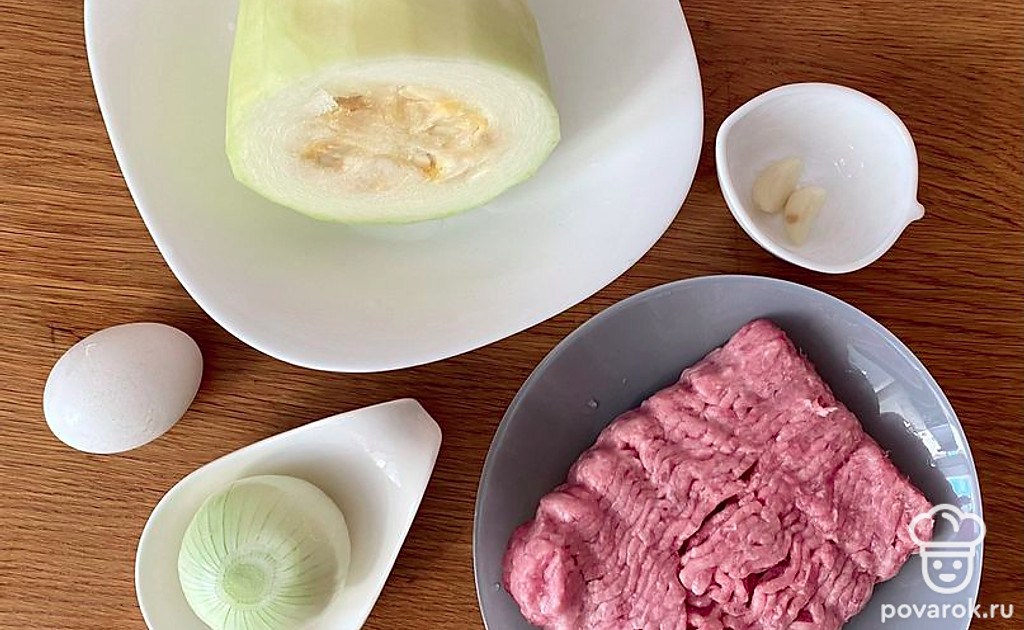 Подготавливаем все необходимые ингредиенты. Кабачок заранее очищаем от кожуры, чеснок с луком освобождаем от шелухи.