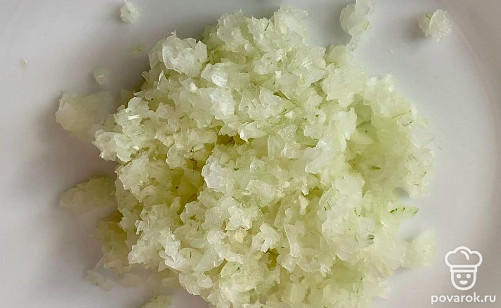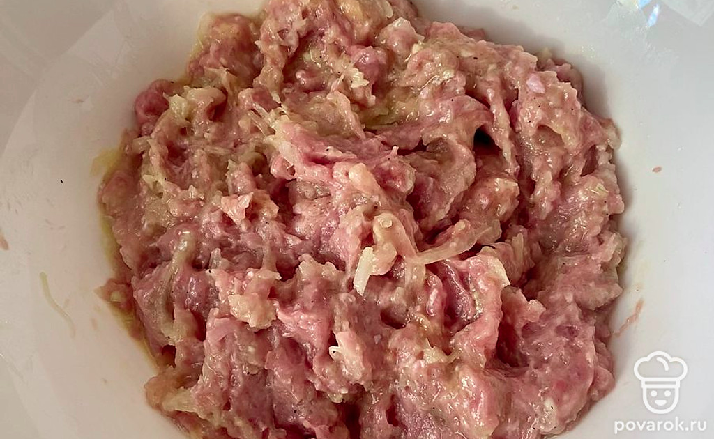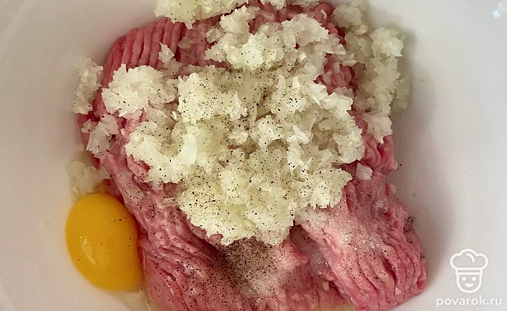 В отдельной емкости соединяем лук, чеснок, фарш и яйцо. Солим, перчим, добавляем специи по вкусу.