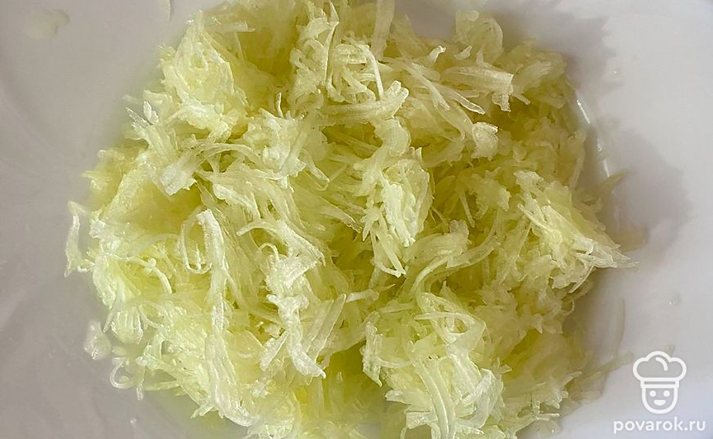 На средней терке измельчаем кабачок и отжимаем с него воду.