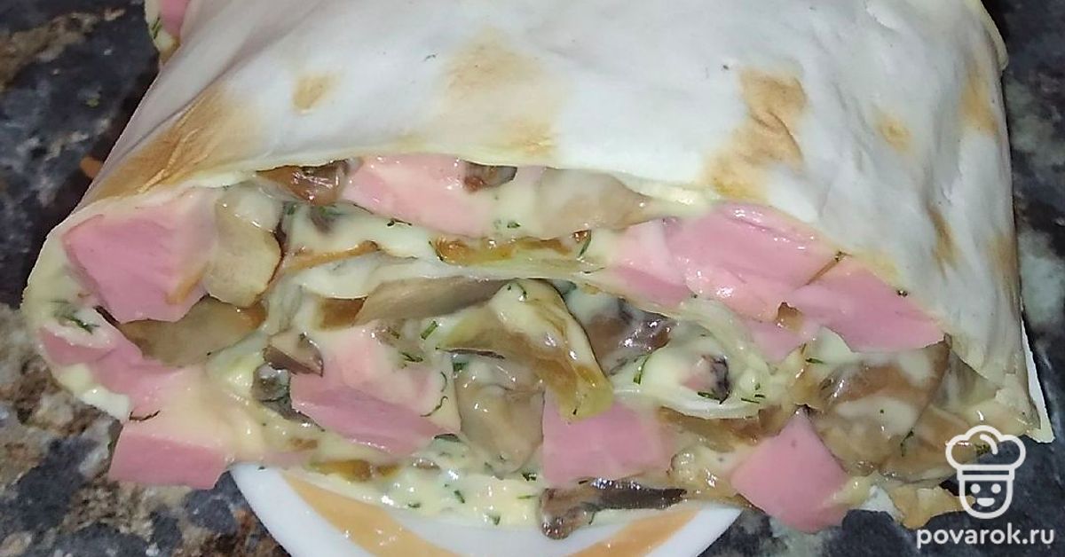 Далее добавьте майонез и все хорошо перемешайте. Лаваш смажьте тонким слоем майонеза. Выложите сверху получившуюся начинку, сверните лаваш. Дайте настояться 15 минут в холодильнике.