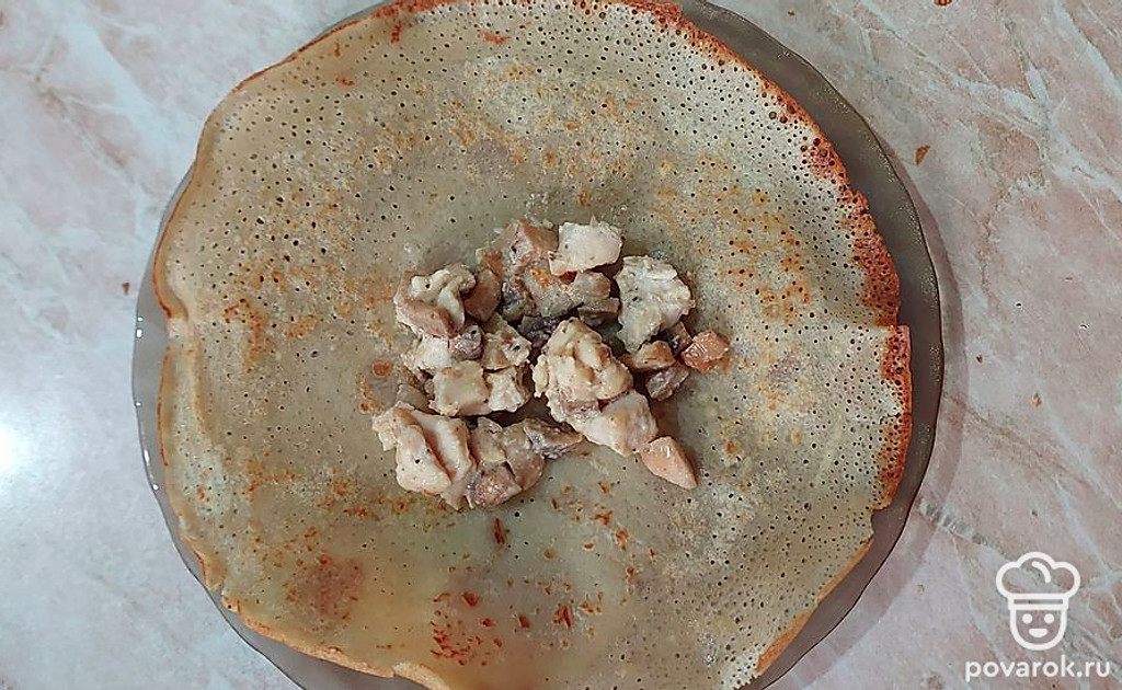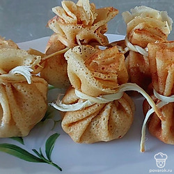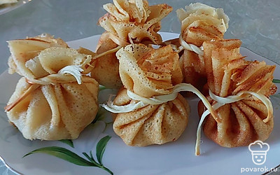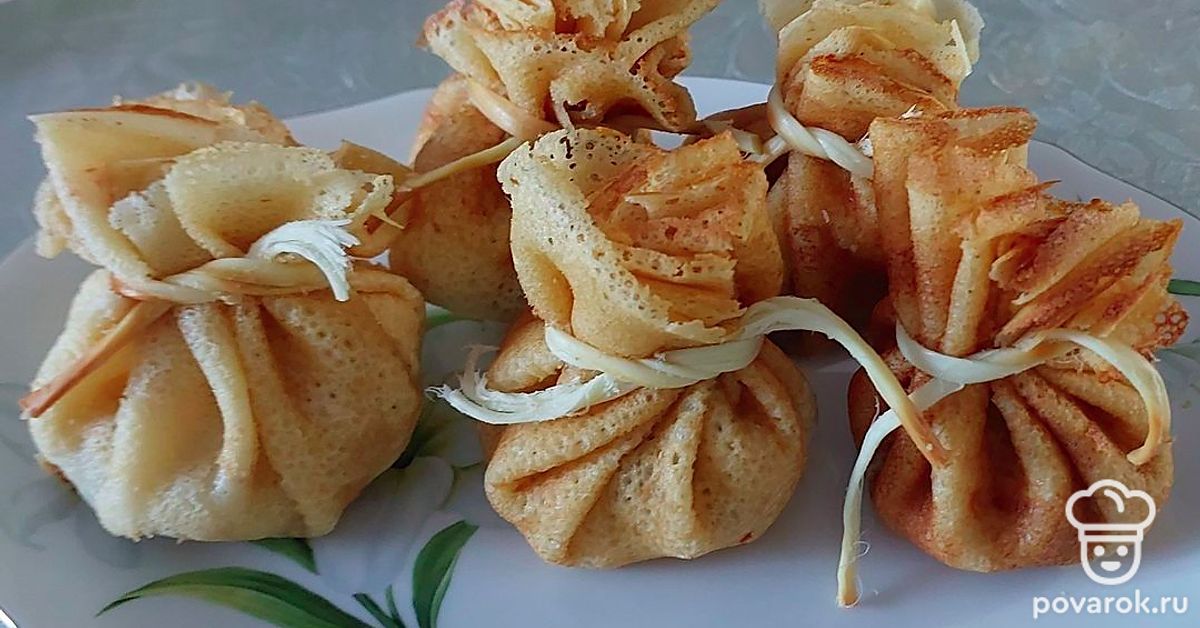 Выложите начинку в центр блинчика. Защипните края, формируя мешочек. Закрепите верх блинчика жгутиком сыра косичка.