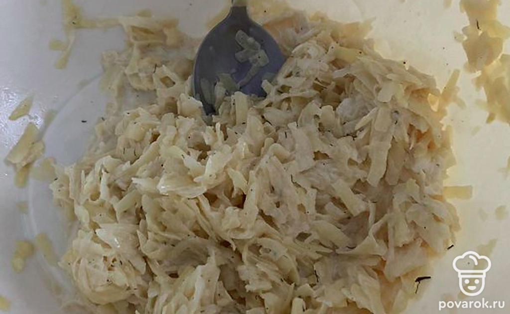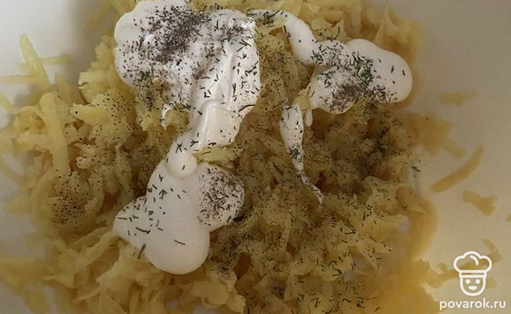 Добавьте майонез, перец, соль. Можно добавить сметану.