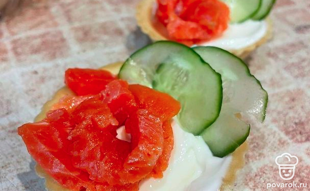 Огурец нарежьте тонкими кусочками, добавьте в тарталетки.