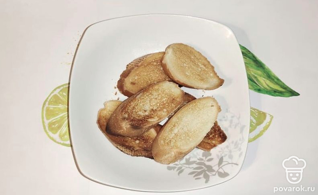 Нарежьте кусочками багет, подсушите в духовке, на сковороде или в тостере до золотистого цвета.