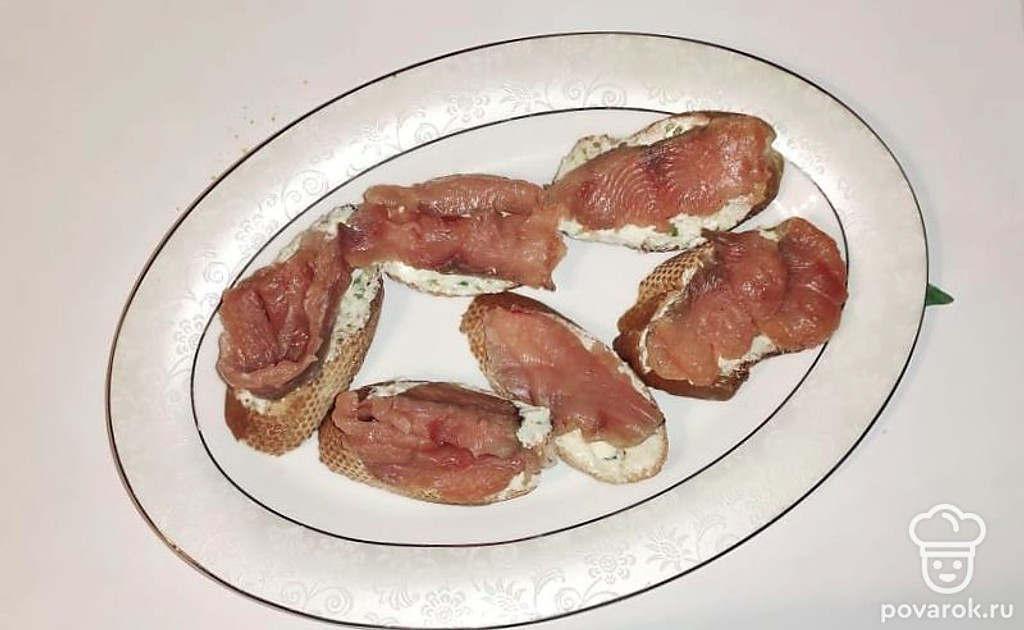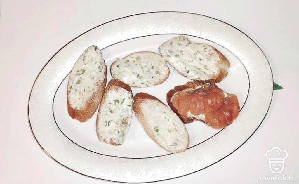 Ломтики багета намажьте маслом, сверху выложите кусочки горбуши.