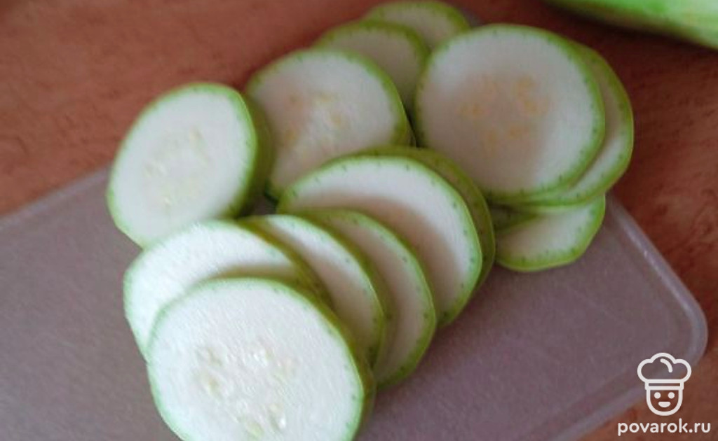 Кабачок среднего размера вымойте, нарежьте колечками (0,5 сантиметров толщиной).