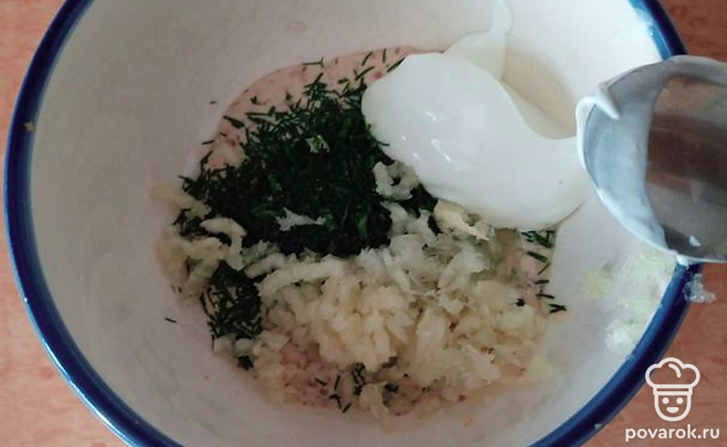Кунжутный соус смешайте со сметаной, выдавите чеснок, добавьте мелко нарезанную зелень и перемешайте.