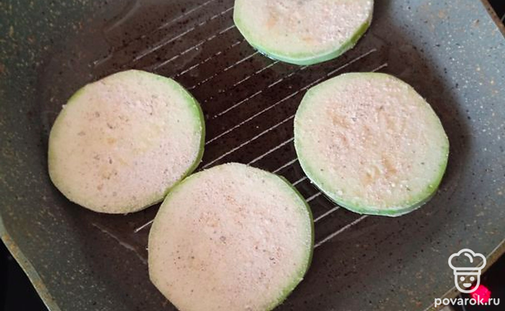 Кабачки обваляйте в рисовой муке или смеси для панировки. Жарьте на разогретой сковороде до румяной корочки.