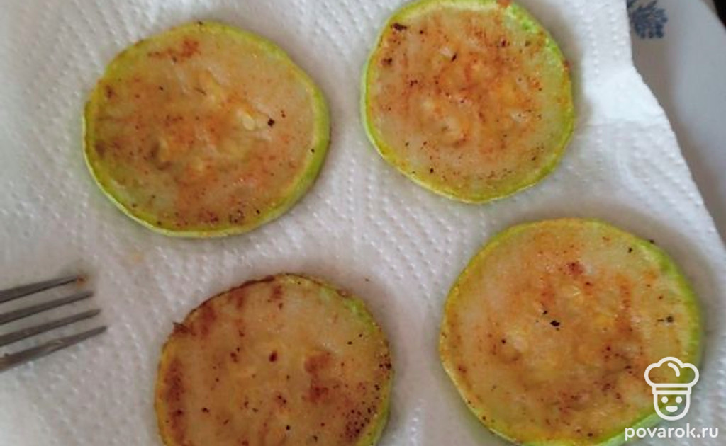 Затем готовые кабачки выложите на бумажное полотенце, чтобы впиталось лишнее масло.