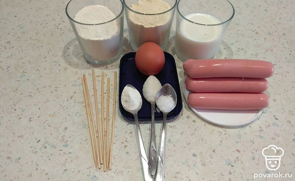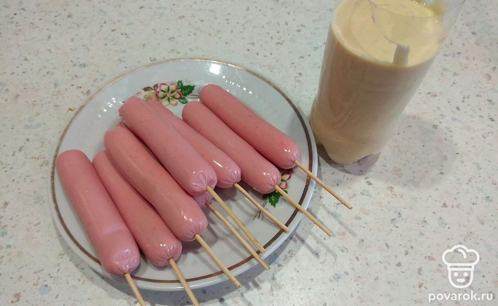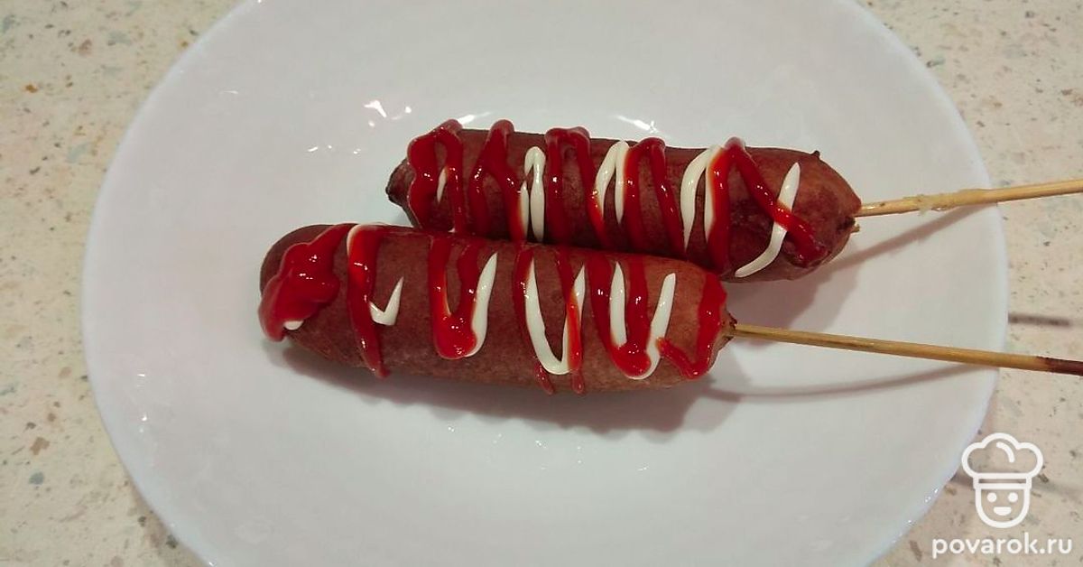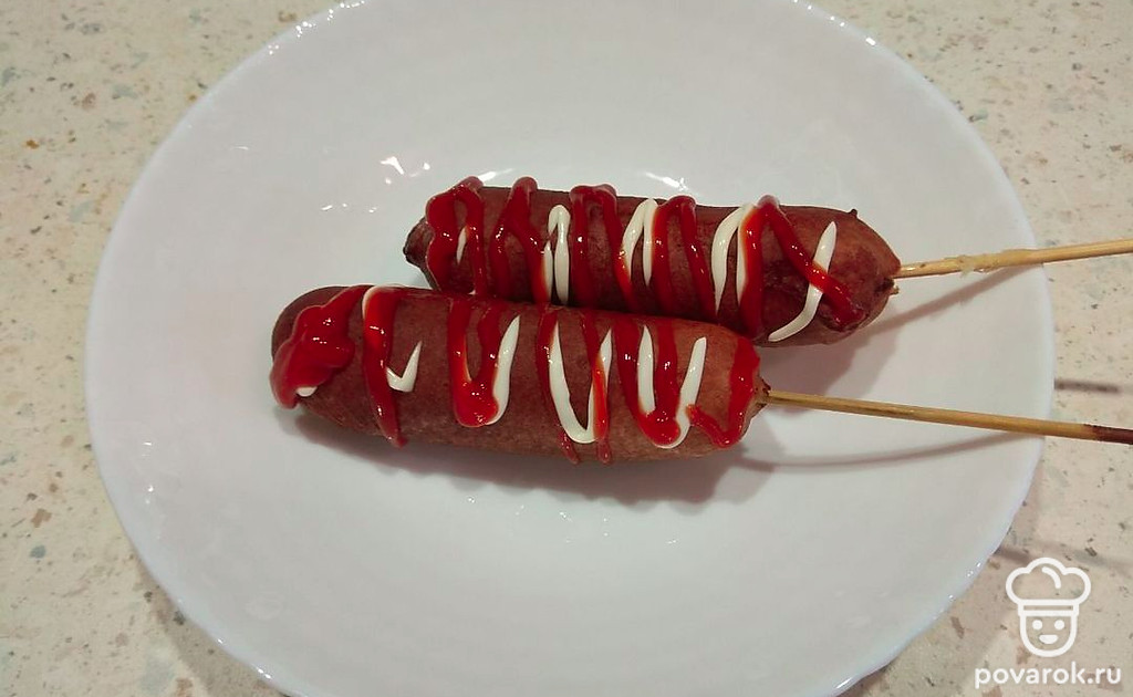Окуните сосиски в тесто до шпажки и слегка проверните, чтобы оно равномерно распределилось по сосиске.