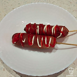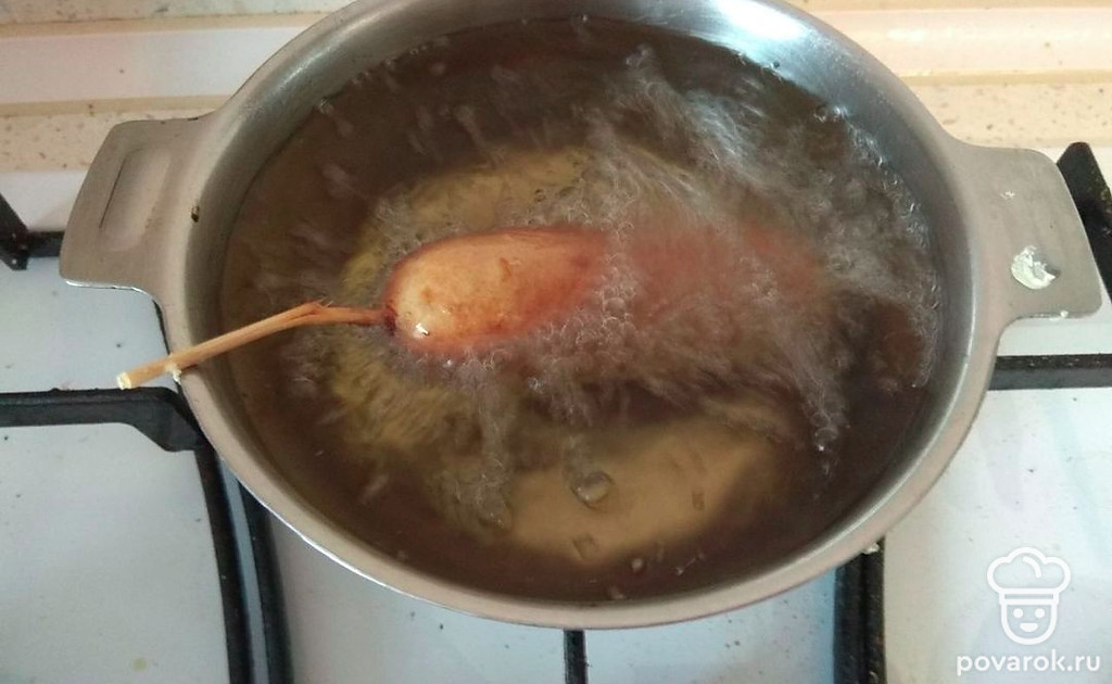 По очереди обжарьте сосиски во фритюре, проворачивая за шпажку, чтобы сосиска равномерно прожарилась. Если взяли маленькую посуду для экономии масла, шпажку можно слегка надломить.