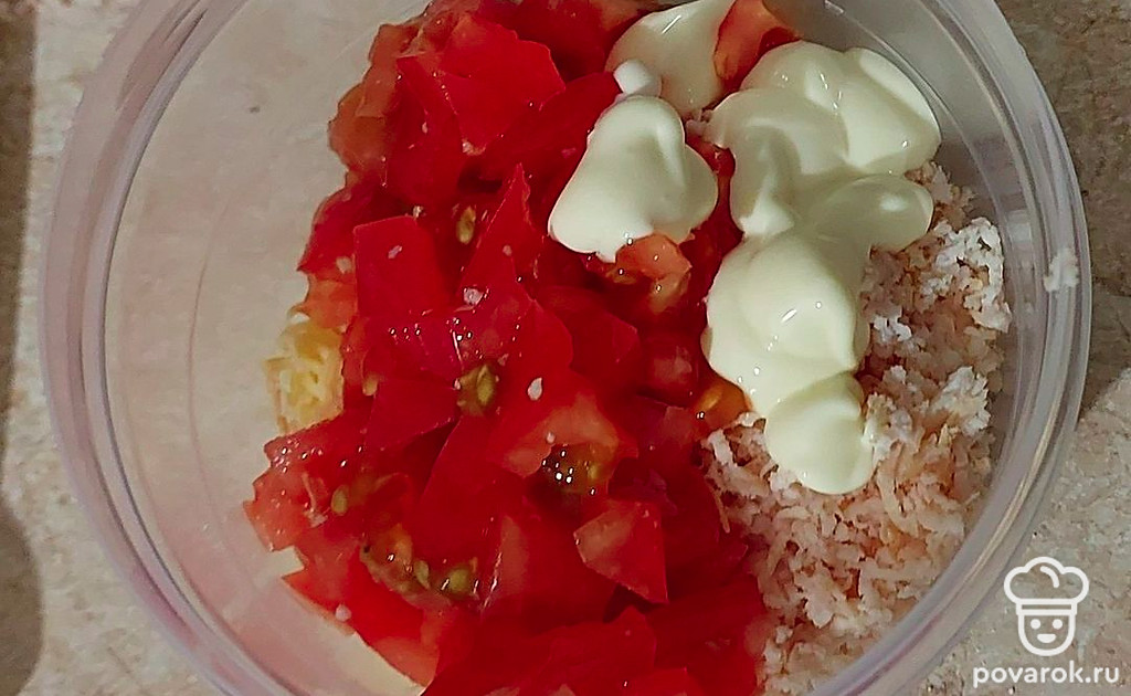 Нашинкуйте помидор. Соедините с сыром, курицей и майонезом. Тщательно перемешайте.