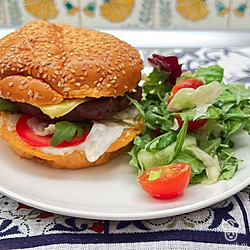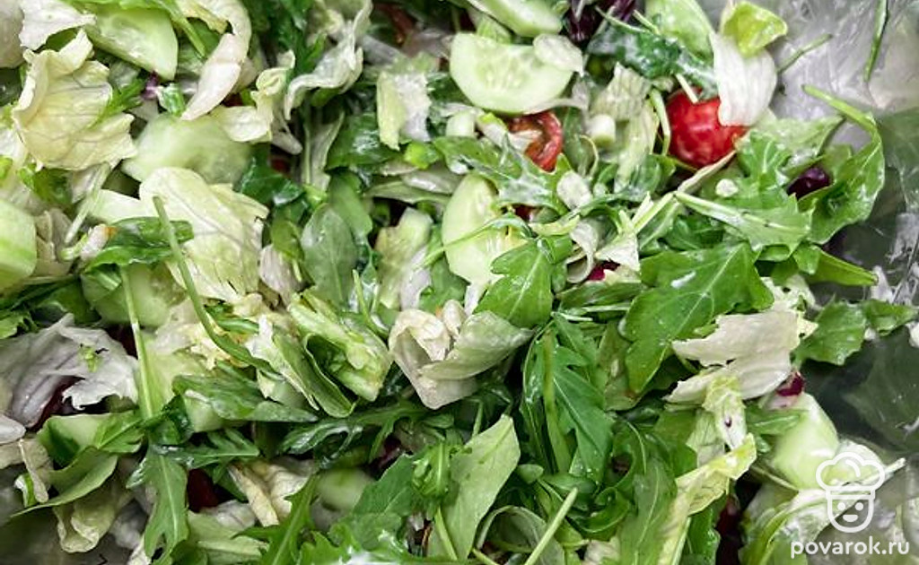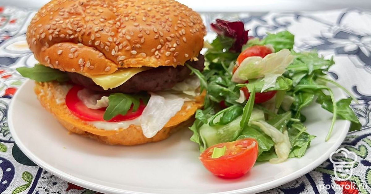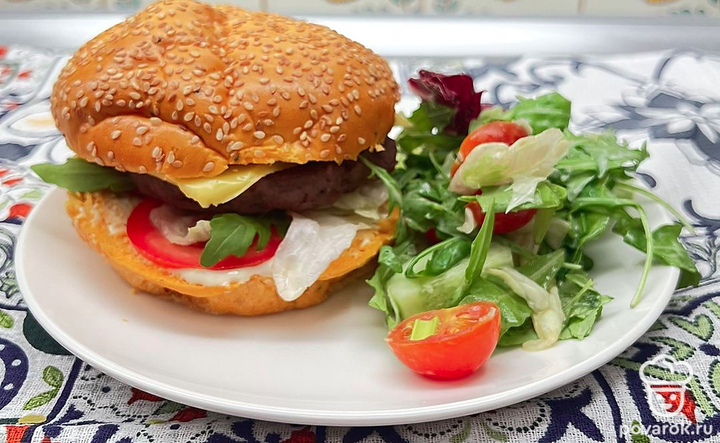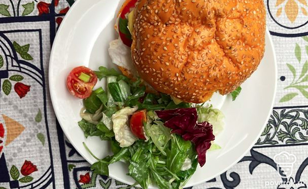 Бургер можно подать с картофелем фри, но вариант с салатом необычный и более полезный. Приятного аппетита!