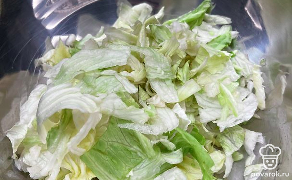 Для приготовлени салата использую разную зелень. В глубокую миску насыпьте промытый салат айсберг.