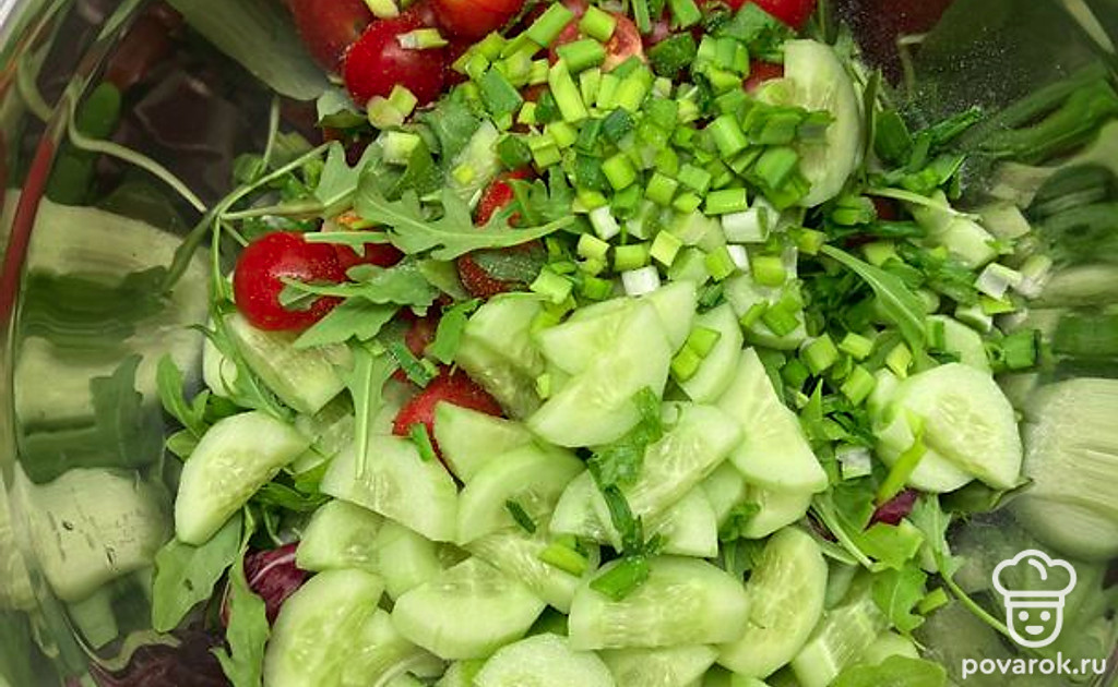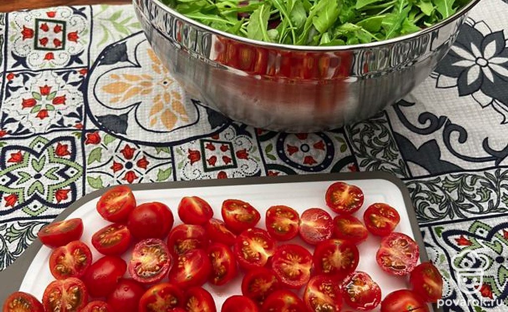 Добавьте рукколу, радиччио или другой вид салата по вкусу. Помидоры черри помойте и разрежьте на половинки.