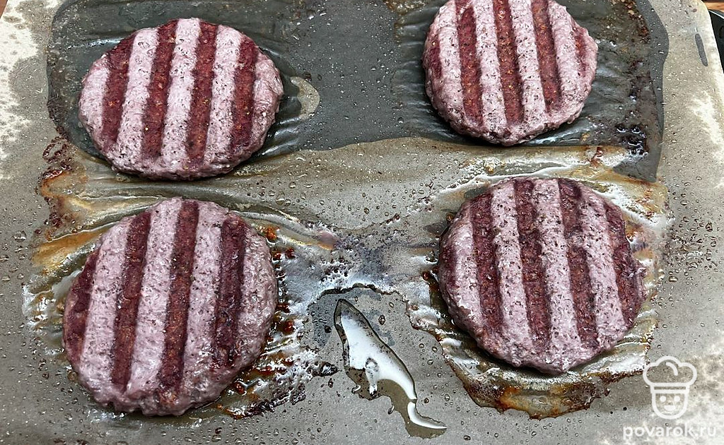 Котлеты для бургеров посолите, поперчите по вкусу и обжарьте на гриле или сковороде до готовности. Я жарила на гриле на пергаменте без масла по 3-4 минуты с каждой стороны.