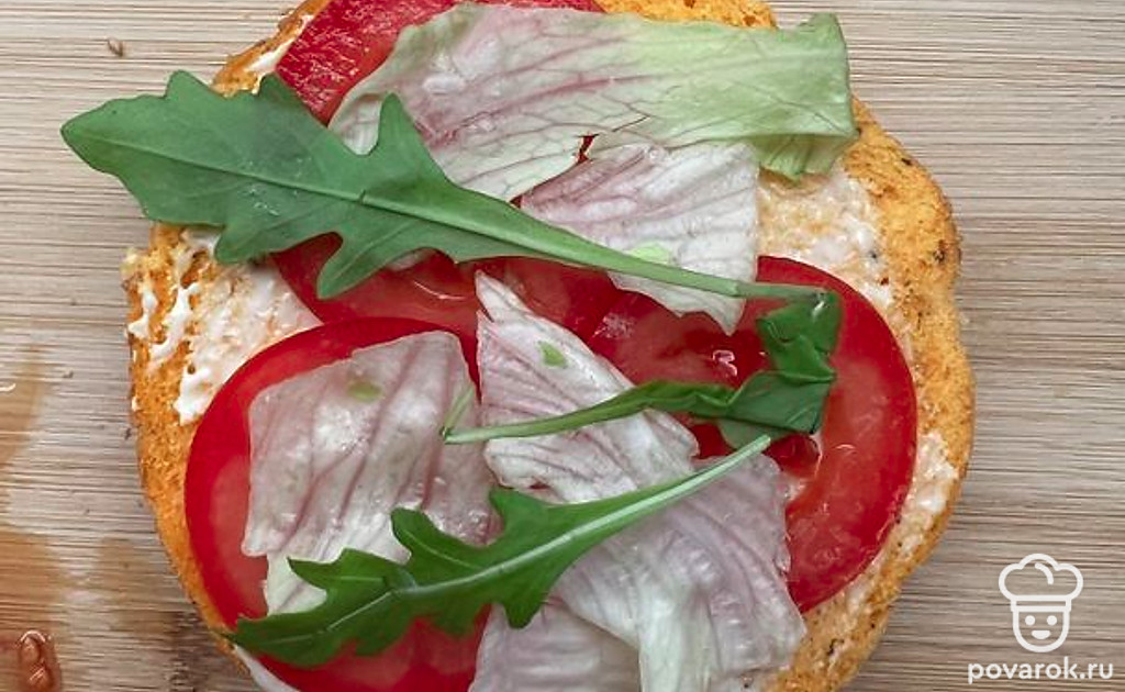 Булочку для бургера разрежьте пополам, смажьте майонезом. Выложите помидор, пару листиков зелени, посолите по вкусу.