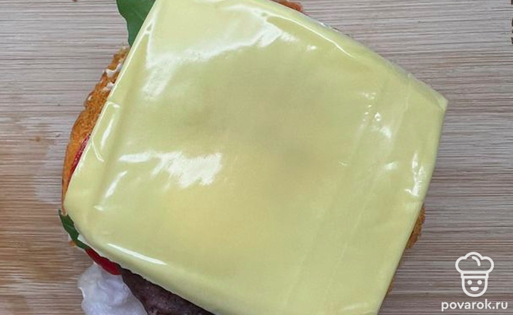 Сверху выложите котлету, по желанию можно добавить ломтик мягкого сыра. И снова закройте булочкой.