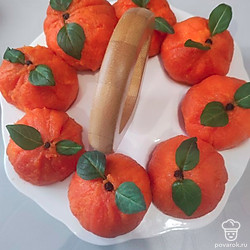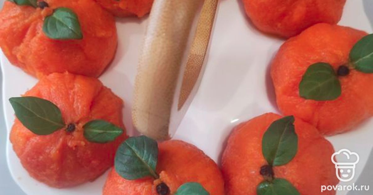 Украсьте мандаринки листиками базилика и черным горошком. Вкусная и сочная закуска готова. Приятного аппетита!