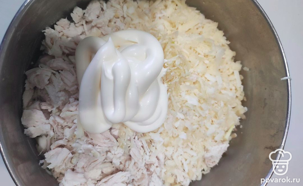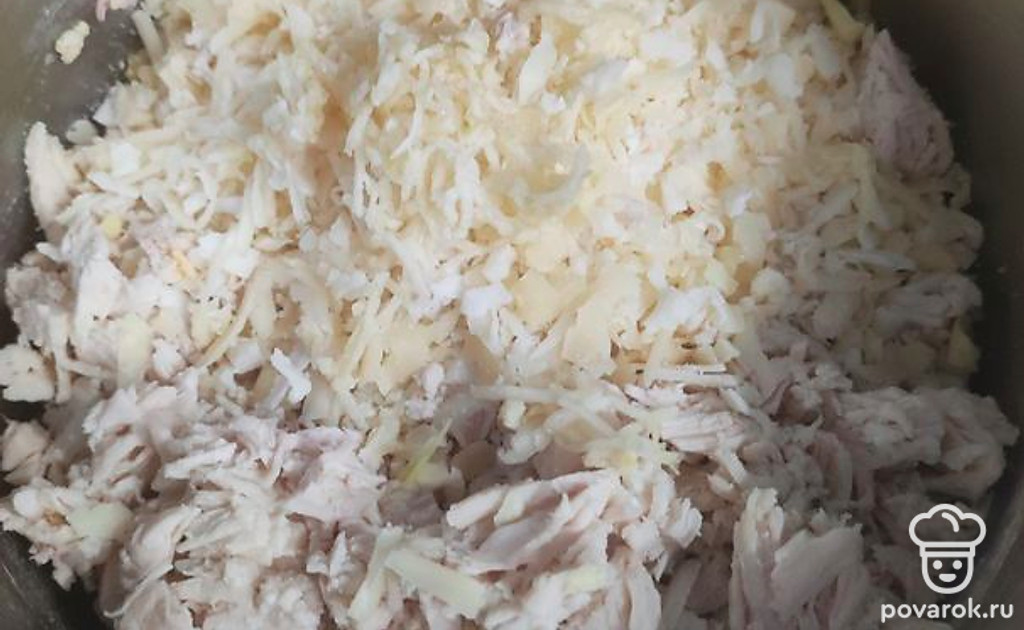 Смешайте мелко нарезанную вареную грудку, натертый на мелкой терке сыр и белок. По вкусу добавьте соль, перец (можно добавить чеснок).