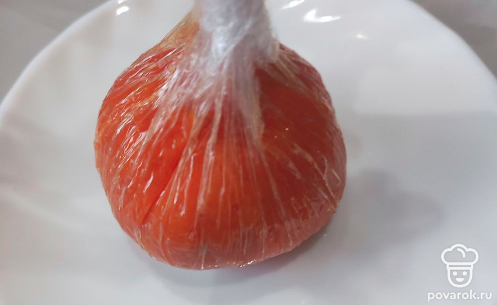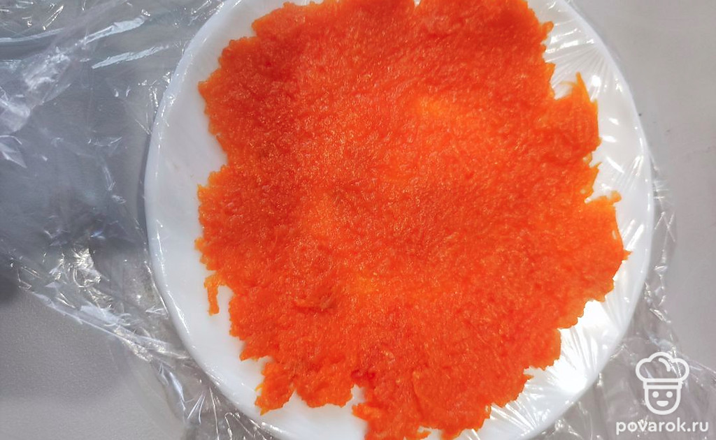 Отварную морковь натрите на мелкой терке, блюдце застелите пленкой. На пленку тонким слоем намажьте морковь.
