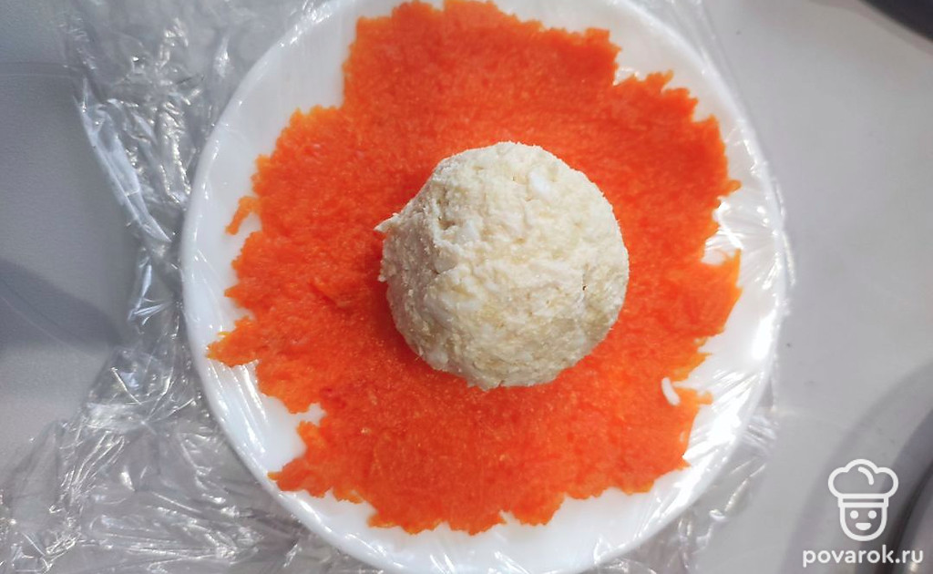 Из полученной смеси (шаг 2), сформируйте шарик. Выложите на морковь в центр.