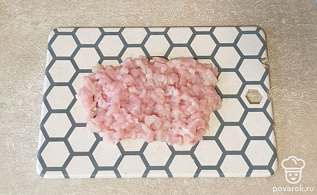 Филе промойте в воде и нарежьте на очень мелкие кусочки.