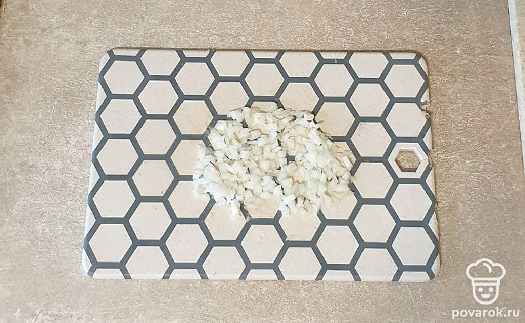 Лук очистите от кожуры и также мелко нарежьте.