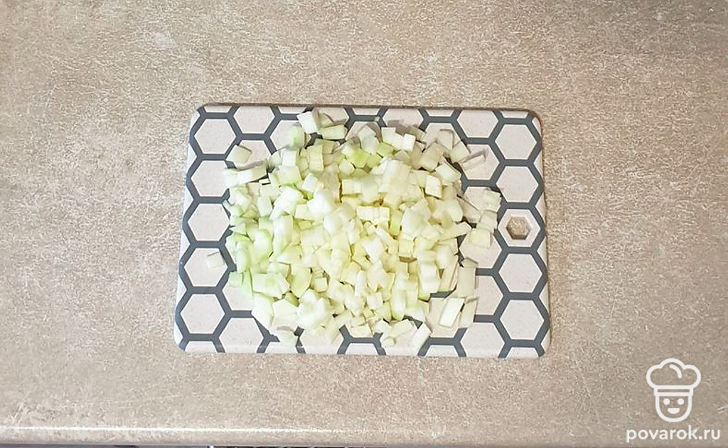 Цукини очистите от кожуры и нарежьте небольшим кубиком.