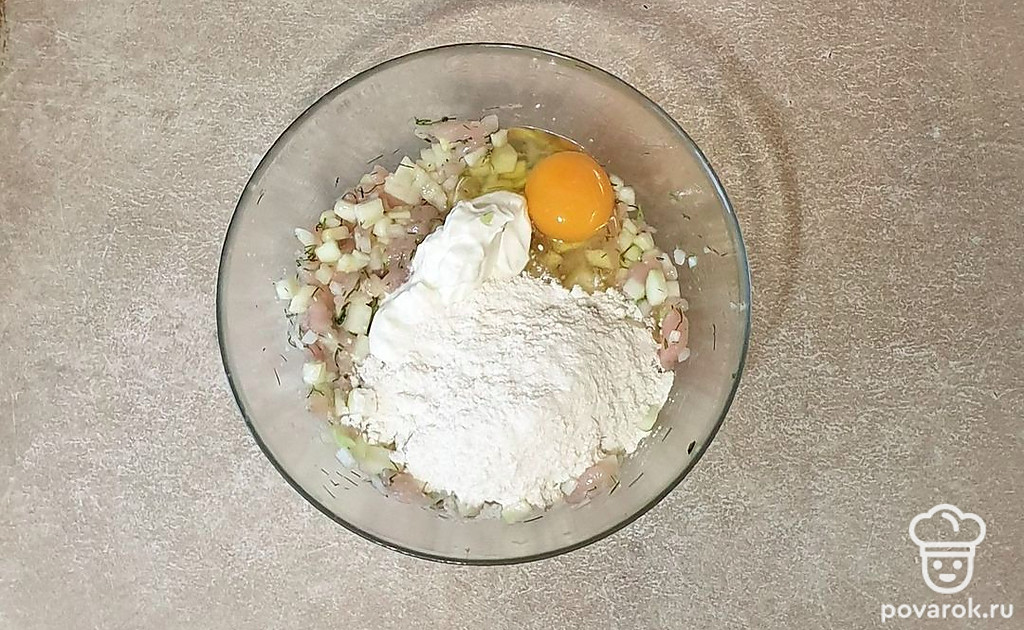 В глубокой миске смешайте все нарезанные ингредиенты. Вбейте яйцо, всыпьте специи, муку и добавьте сметану. Хорошо перемешайте.