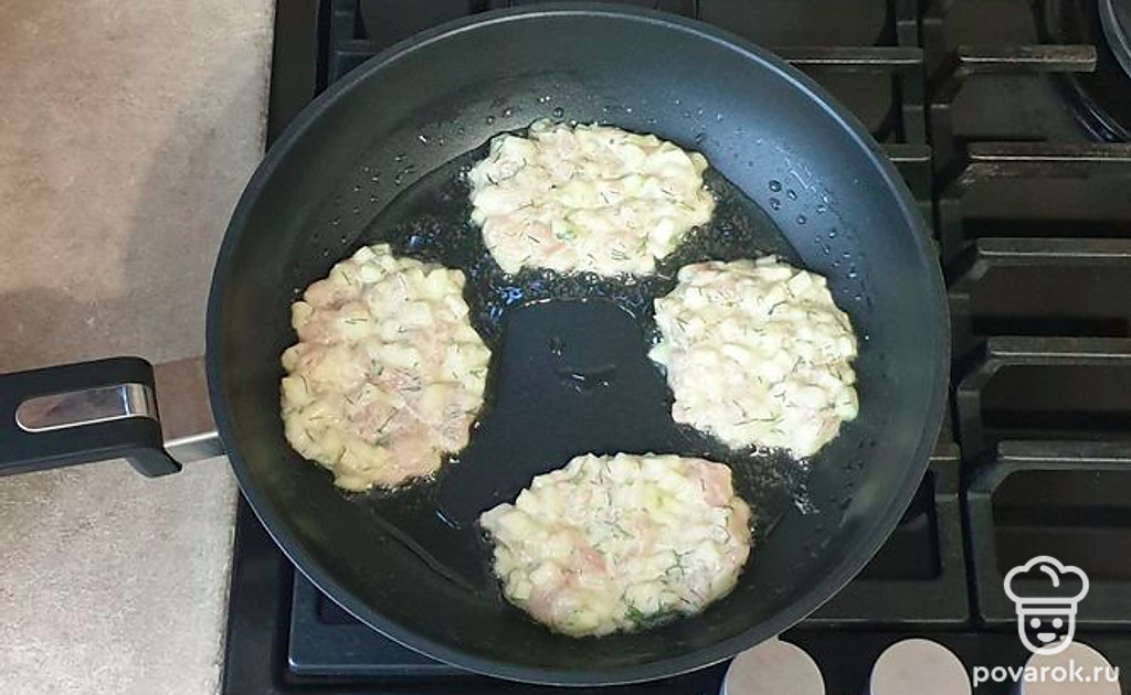 На разогретую сковороду столовой ложкой выкладывайте фарш. Обжаривайте с каждой стороны 5-7 минут, до золотистого цвета.