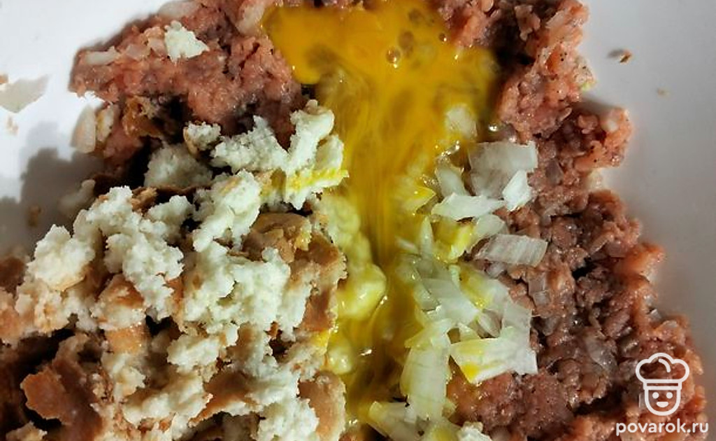 К фаршу горбуши добавить мелко нарезанный лук, замоченный хлеб, яйцо и хорошо перемешать.
