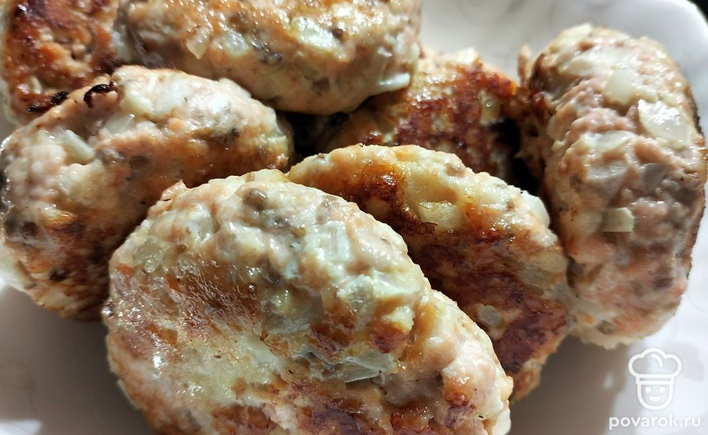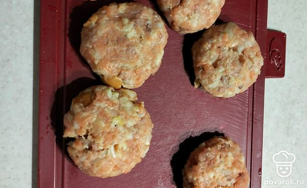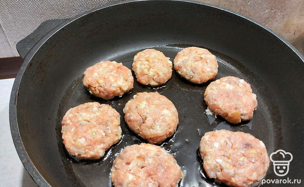 Разогреть сковороду, влить масло и выложить котлеты. Обжарить на слабом огне до золотистого цвета с каждой стороны.