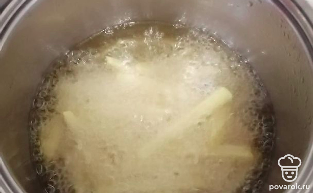 В кастрюлю наливаем 200 мл растительного масла, обжариваем картофель в кипящем масле до золотистой корочки.
