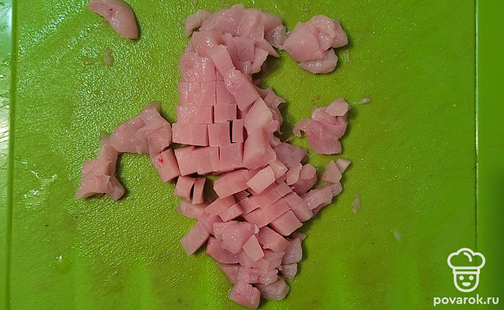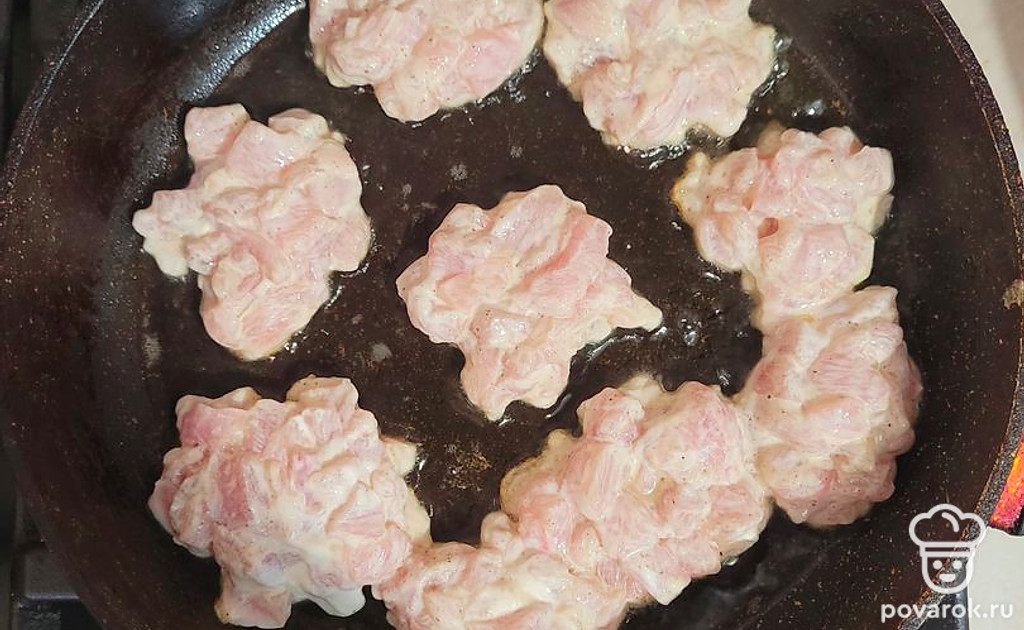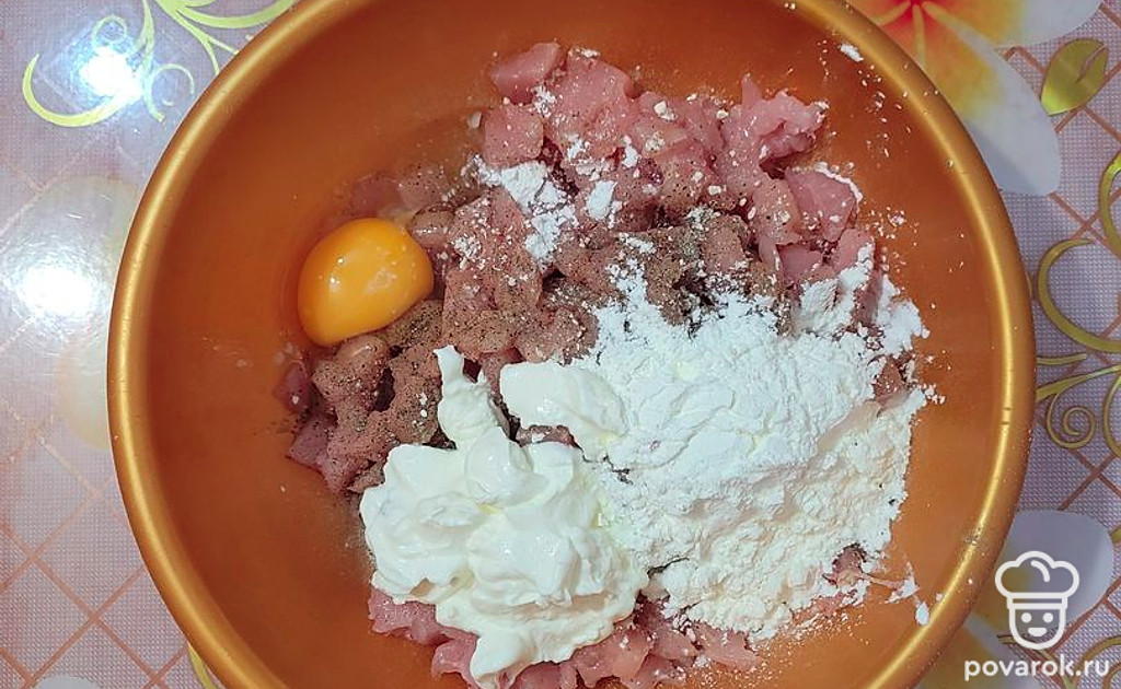 В глубокой посуде смешайте нарезанную куриную грудку с яйцом, сметаной и кукурузным крахмалом. Посолите, поперчите, оставьте мариноваться на 1 час.