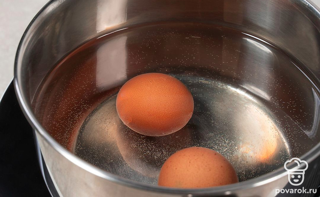 Положите куриные яйца в небольшую кастрюлю, залейте водой и поставьте на сильный огонь. Варите 10 минут после закипания. Остудите яйца в ледяной воде и очистите их от скорлупы.