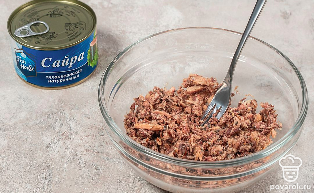 Можно измельчить рыбу при помощи мясорубки или блендера. Но сайра достаточно мягкая и легко разминается вилкой.