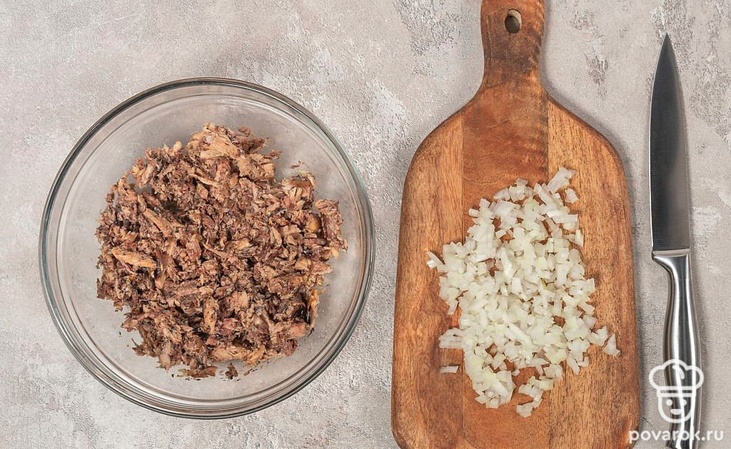 Мелко покрошите репчатый лук. Добавьте его в миску с сайрой и хорошенько перемешайте.