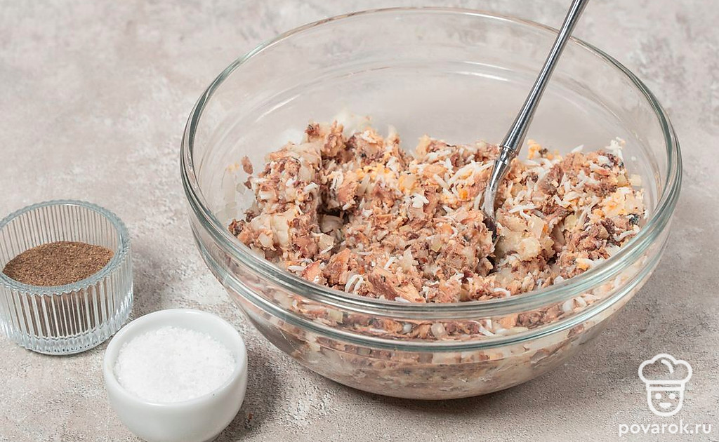 Приправьте фарш солью и черным молотым перцем. Хорошенько перемешайте. Если фарш получается сухим, влейте жидкость, слитую из консервов.