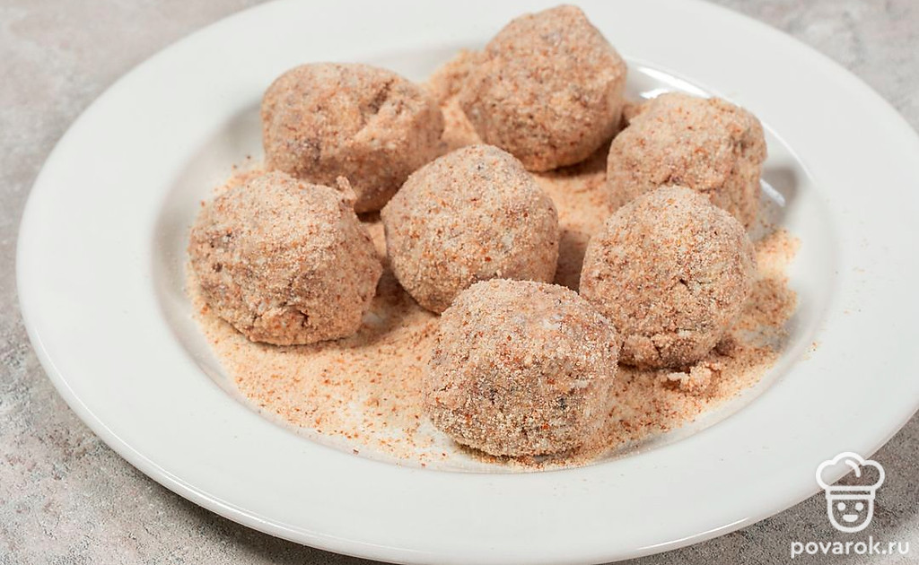 Слепите влажными руками небольшие котлеты. Обваляйте каждую в панировочных сухарях.