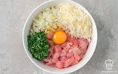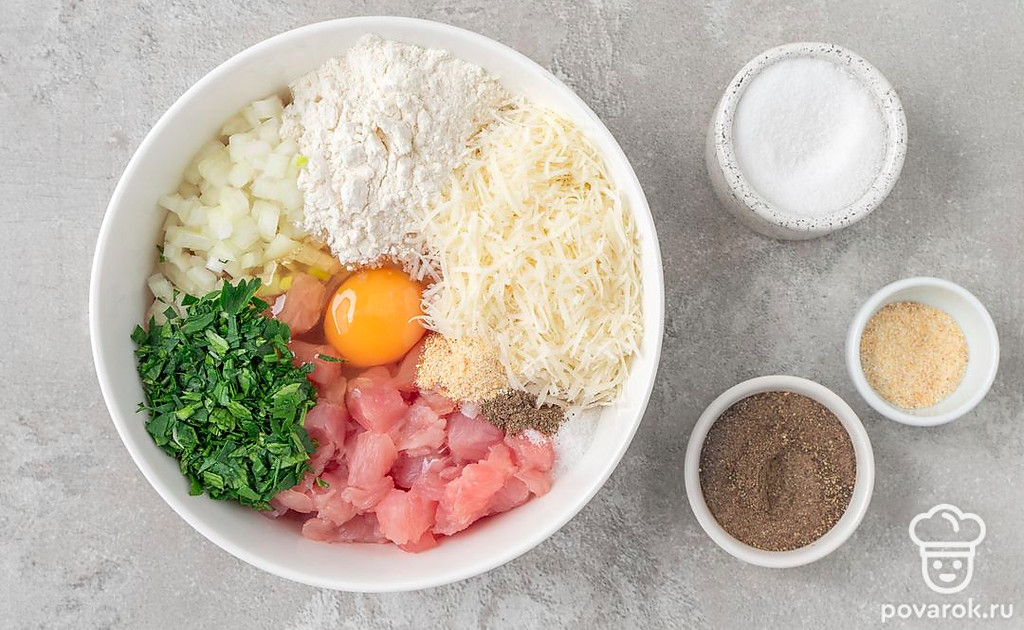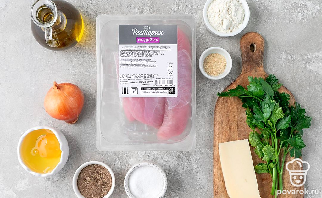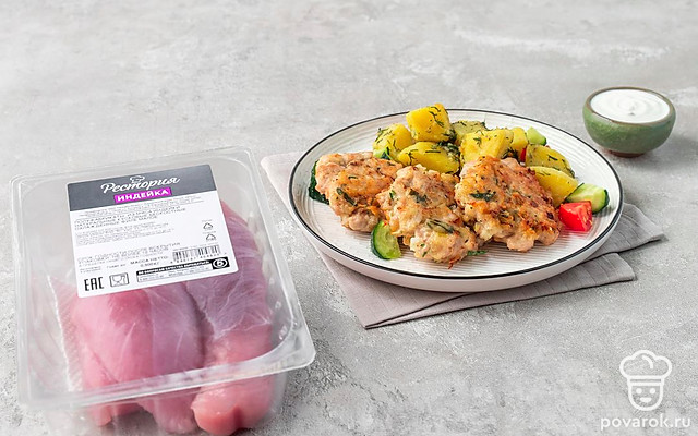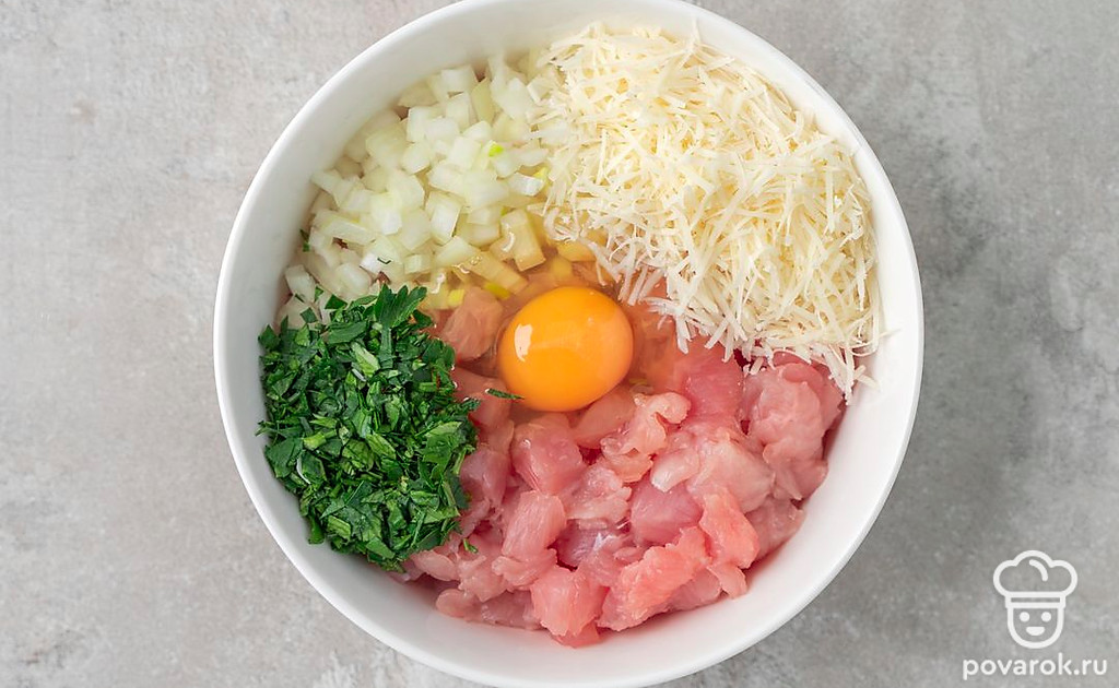 Деликатное филе индейки не нужно пропускать через мясорубку, оно и так будет очень мягким. Мелко порубите филе с луком, соедините с яйцом, мукой и специями. Фарш станет плотным, и в то же время кусочки мяса сохранят свой сок. Для большей мягкости и сливочного вкуса положите в фарш сыр, а для аромата — свежую зелень.