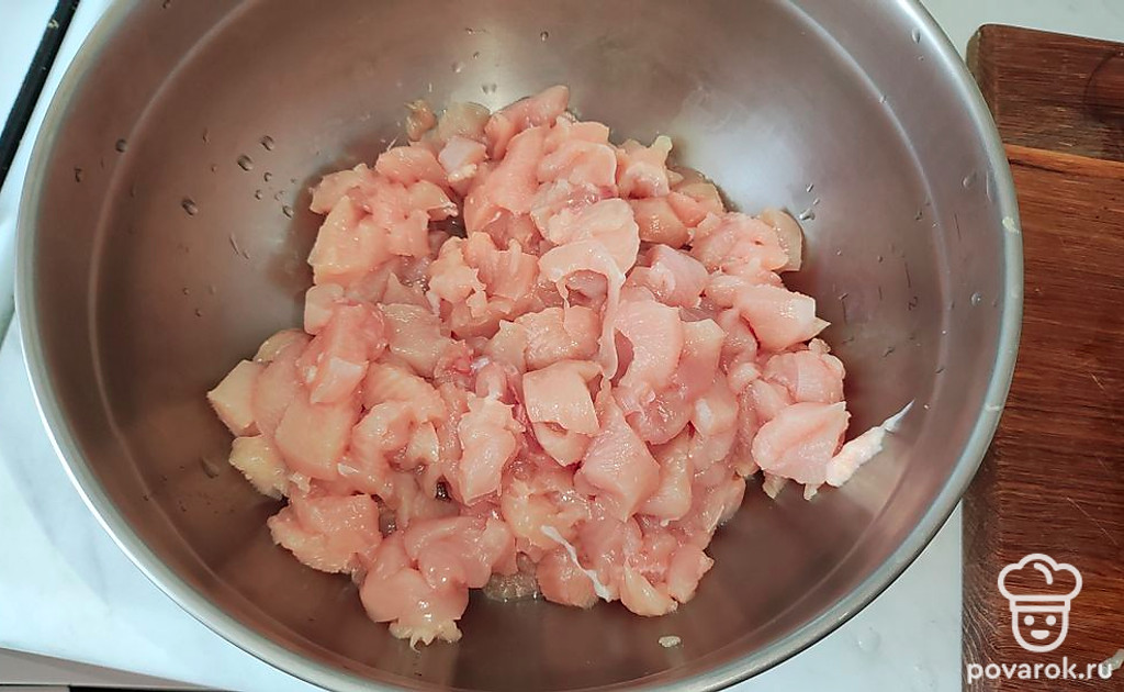 Куриное филе нарежьте мелким кубиком.