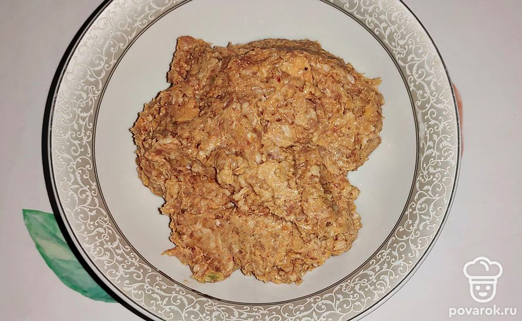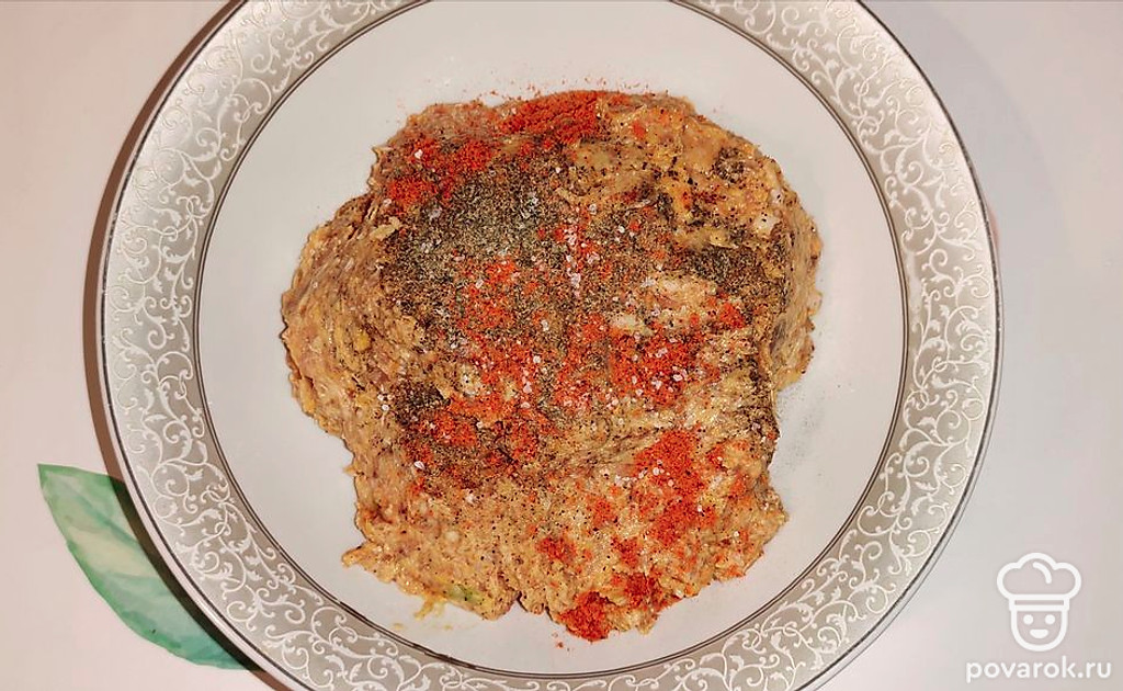 В фарш добавьте специи, перемешайте.