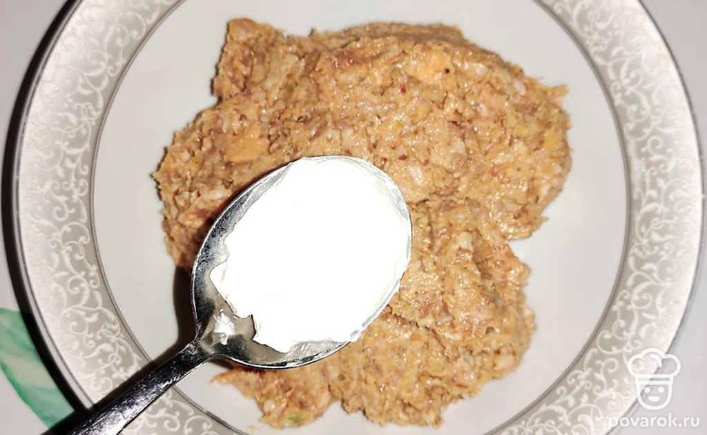 Добавьте в фарш сметану, перемешайте.
