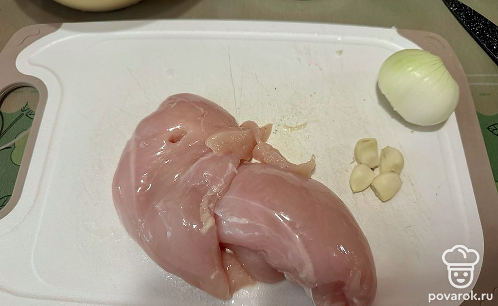 Лук и чеснок очищаем, куриную грудку промываем. Нарезаем на небольшие кусочки. Пробиваем в блендере до однородной массы.